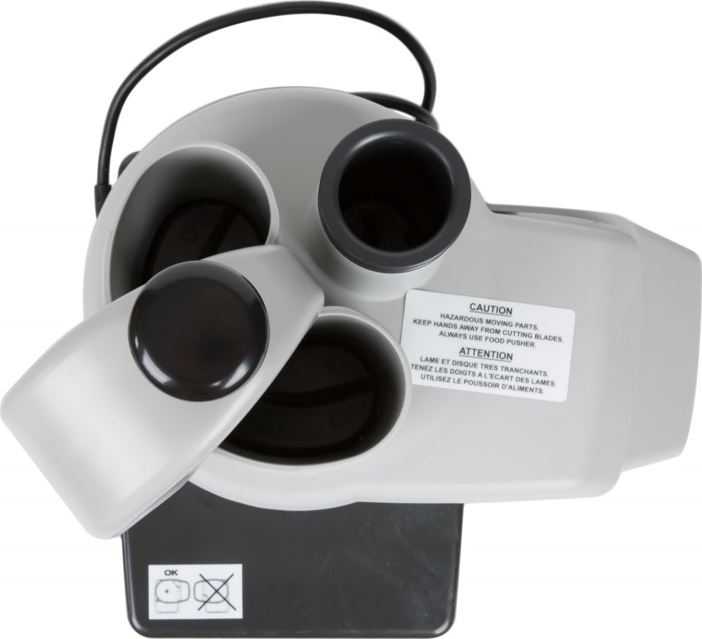 - Боковой выброс продуктов позволяет использовать приёмные ёмкости большого размера и реже забирать нарезанные продукты из ёмкости